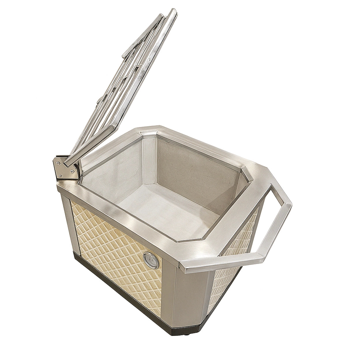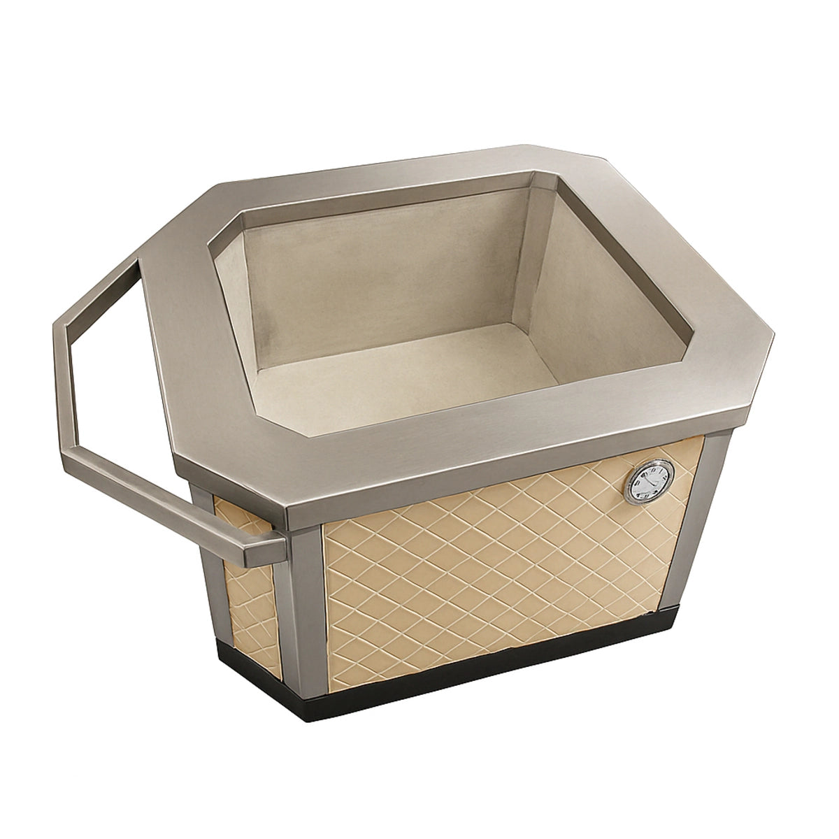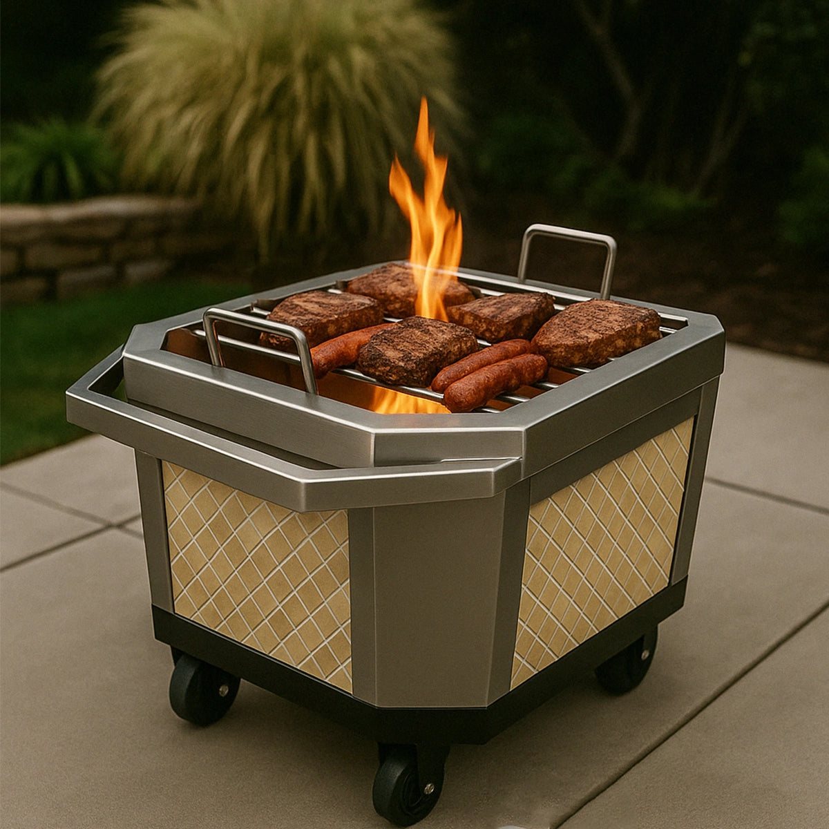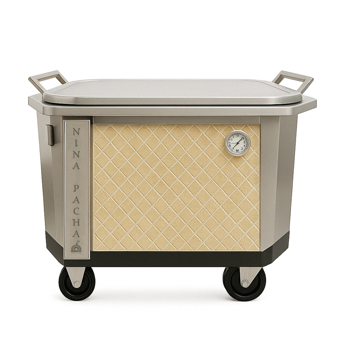 Su interior de cemento refractario retiene el calor de forma eficiente, mientras que su exterior enchapado en mármol y acero inoxidable ofrece una estética impecable y durabilidad a toda prueba. El diseño incluye cuatro garruchas de alta resistencia para una movilidad fluida en cualquier superficie.